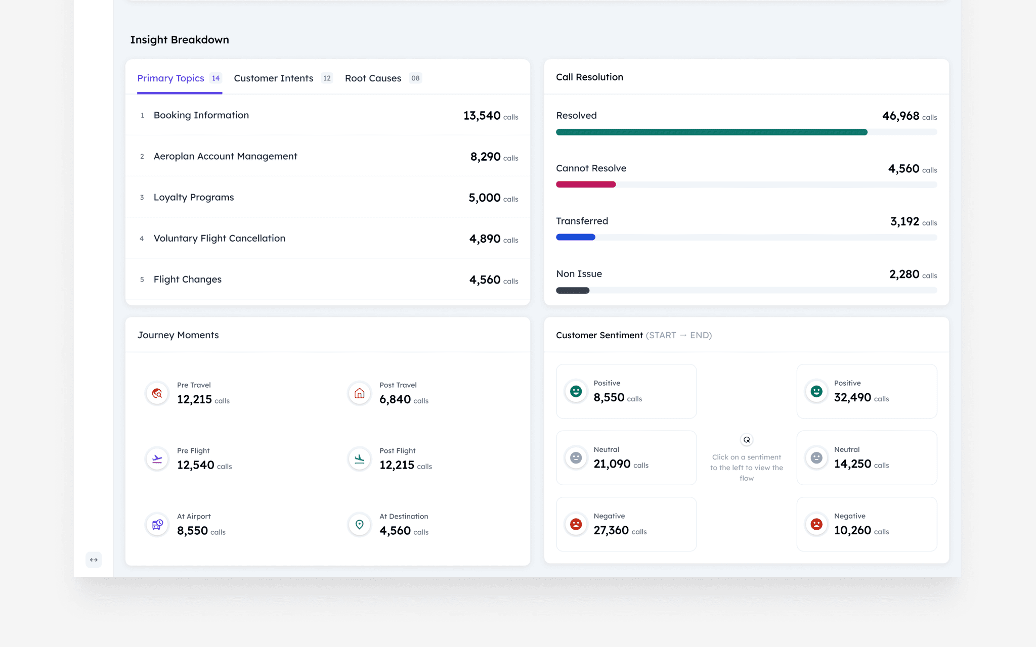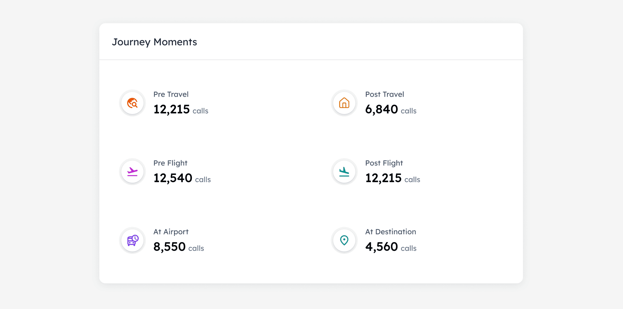This component provides the crucial context of when in the customer journey calls are happening. To make this information easy to digest, I designed the layout as a two-column grid. I intentionally placed related but opposing stages on the same row, such as 'Pre Flight' and 'Post Flight'. This creates logical pairings that allow users to quickly contrast call volumes and spot imbalances between different points in the journey.