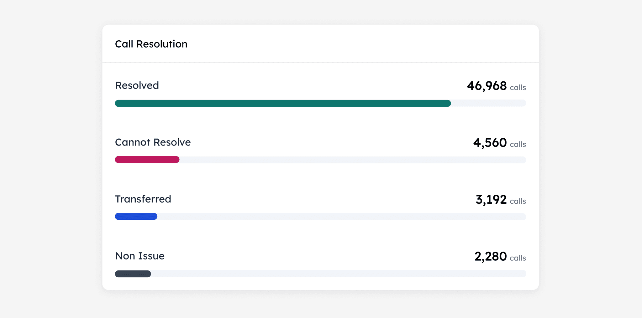 The 'Call Resolution' component is designed to give users a quick, visual summary of call outcomes. While it follows the same scannable, two-column layout as other lists to maintain consistency, I introduced a simple horizontal bar chart for each category. This addition is intentional.