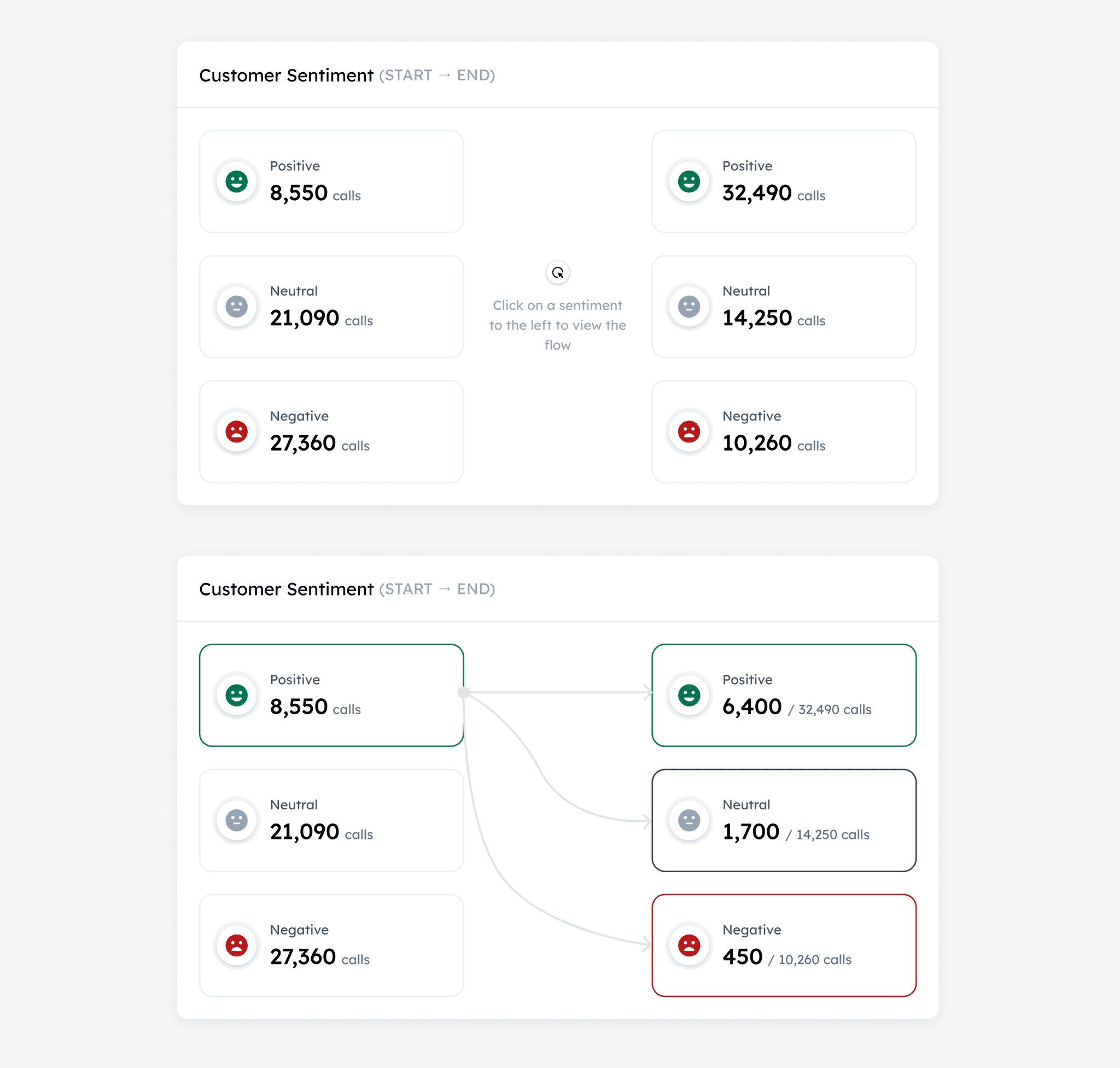 The goal of this component is to show the impact the CC agents have on customer sentiment from the start to the end of a call. I designed the default state as a clean and high-level summary, using the principle of progressive disclosure to invite users to click and explore the data flow. This approach prevents overwhelming users with complex information upfront.