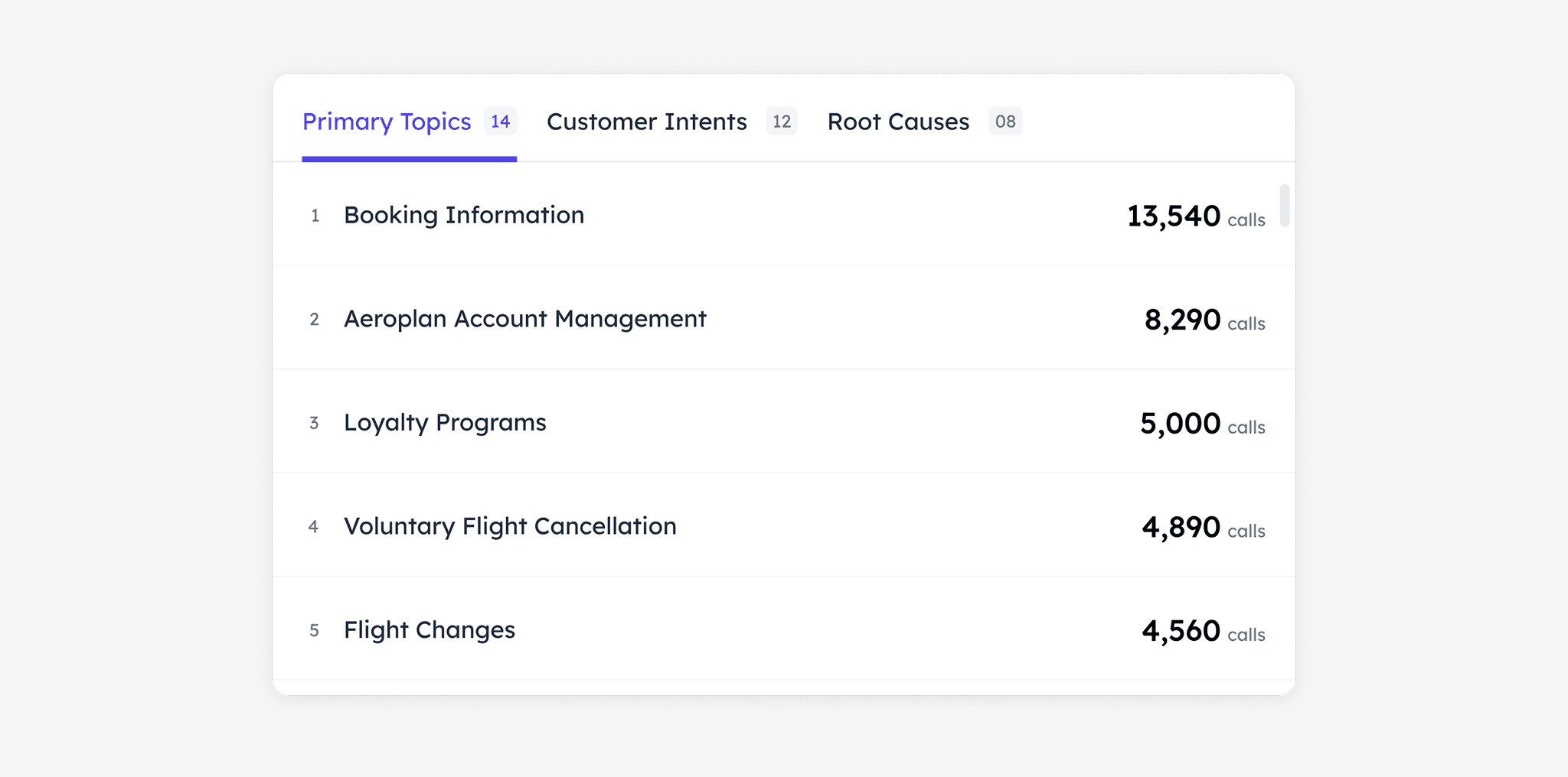 I grouped Primary Topics, Customer Intents, and Root Causes into a single tabbed component because they are all key indicators that help users understand the nature of the calls. Since they share a similar data structure (a text label and a call count), this approach creates a consistent and organized experience.