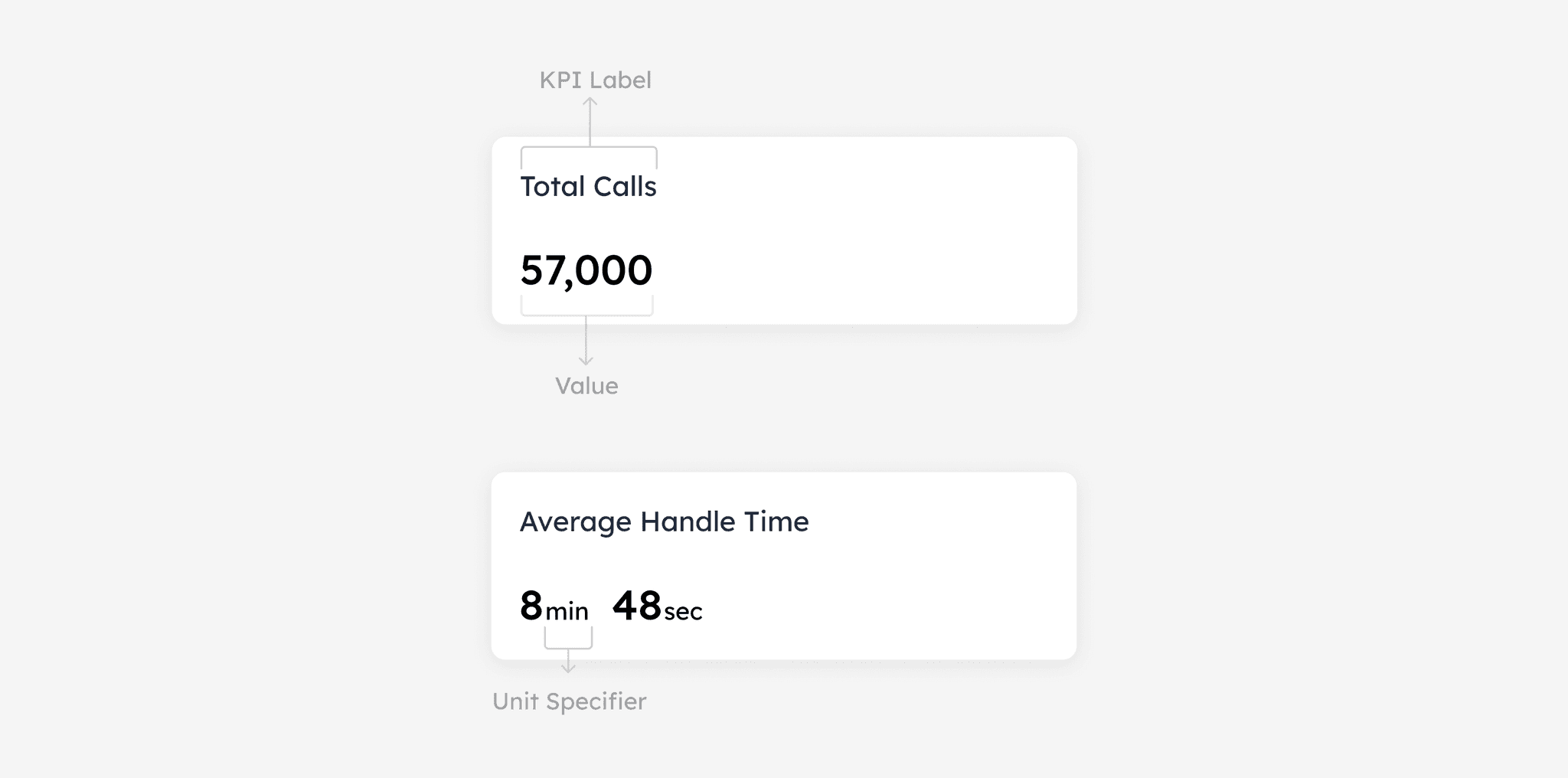 For KPI cards, the value is intentionally the largest and boldest element to make it the immediate focal point. The KPI Label is secondary, providing context without competing for attention. For complex values, the numbers remain the focus while the unit specifiers ("min", "sec") are de-emphasized to provide context without clutter.